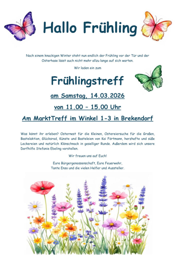 So laden wir euch am Samstag, den 14. März 2026 von 11:00 bis 15:00 Uhr zu einem Frühlingstreff beim elf/96 unseres Brekendorfer MarktTreffs ein 🦋