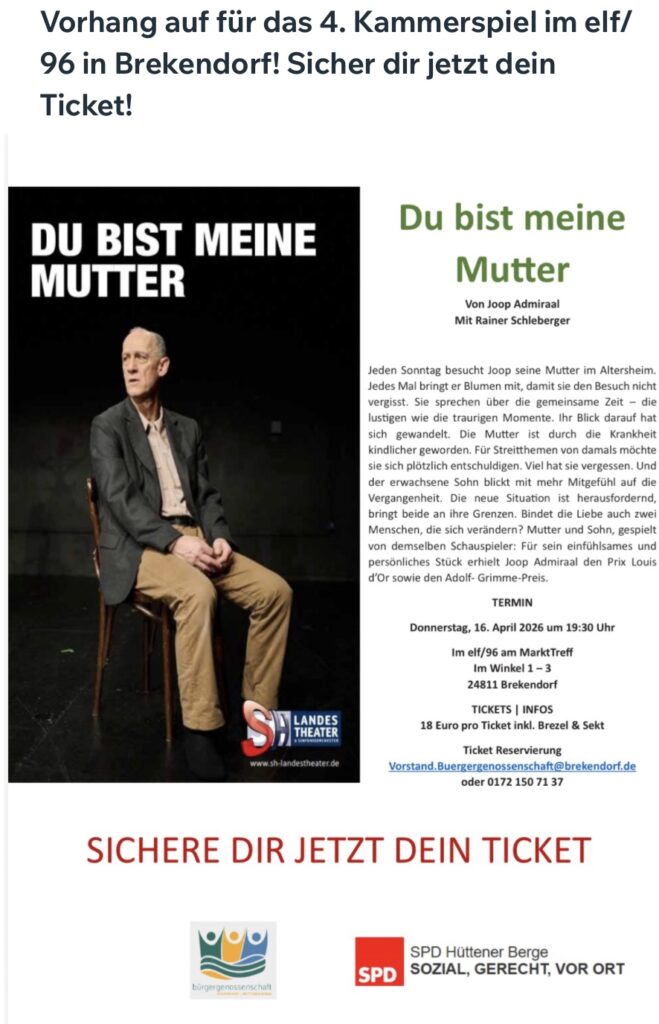 Tickets kannst du unter vorstand.buergergenossenschaft@brekendorf.de oder unter der Telefonnummer 0172-1507137 reservieren.